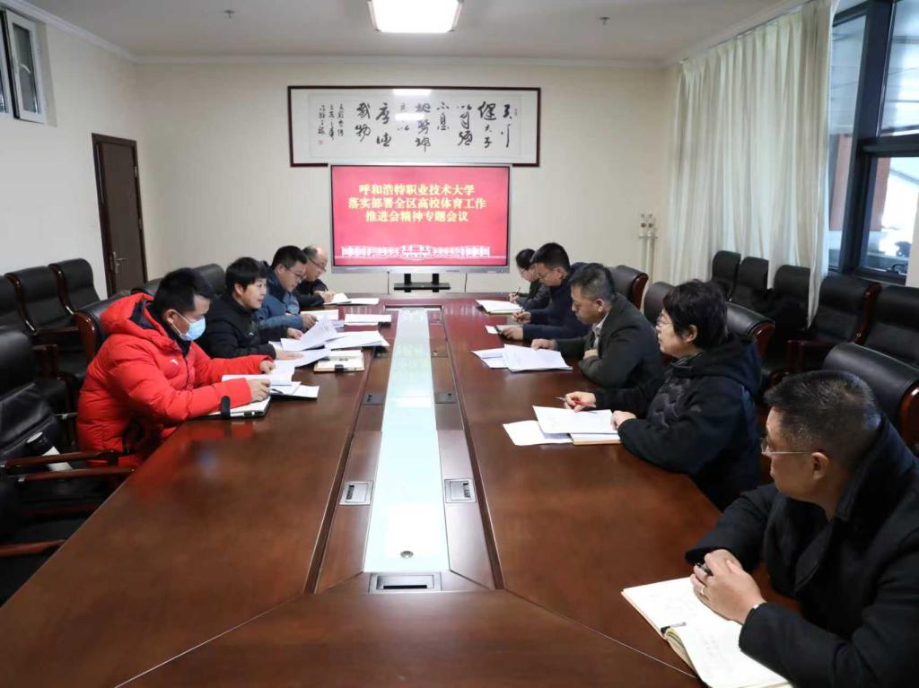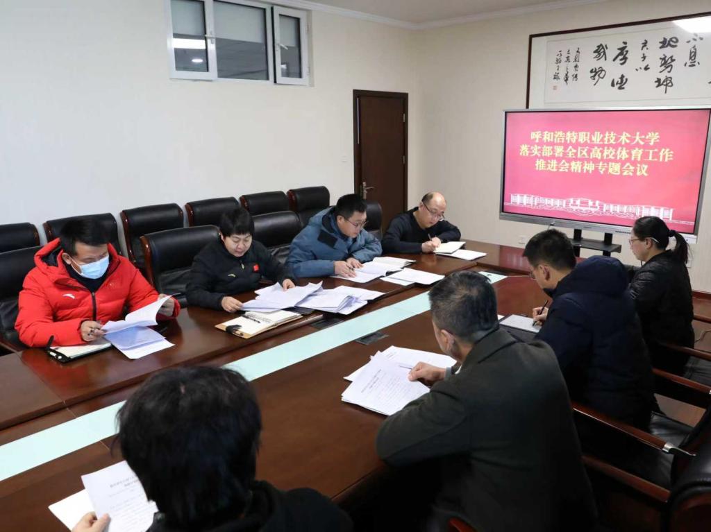 会上,杨乌日吐校长对12月4日内蒙古自治区召开的全区高校体育工作会议精神进行了传达,随后由体育教学部主任范丽珺对《关于全面加强和改进新时代学校体育工作的意见》《教育部等五部门关于实施学生体质强健计划的意见》和《内蒙古自治区促进大学生体质强健十条措施》进行传达,同时将我校拟出台的《呼和浩特职业技术大学学生体质强健工作实施方案》进行了汇报,会上体育运动委员会秘书长成员积极探讨,针对我校学生实际情况给出了宝贵意见建议。