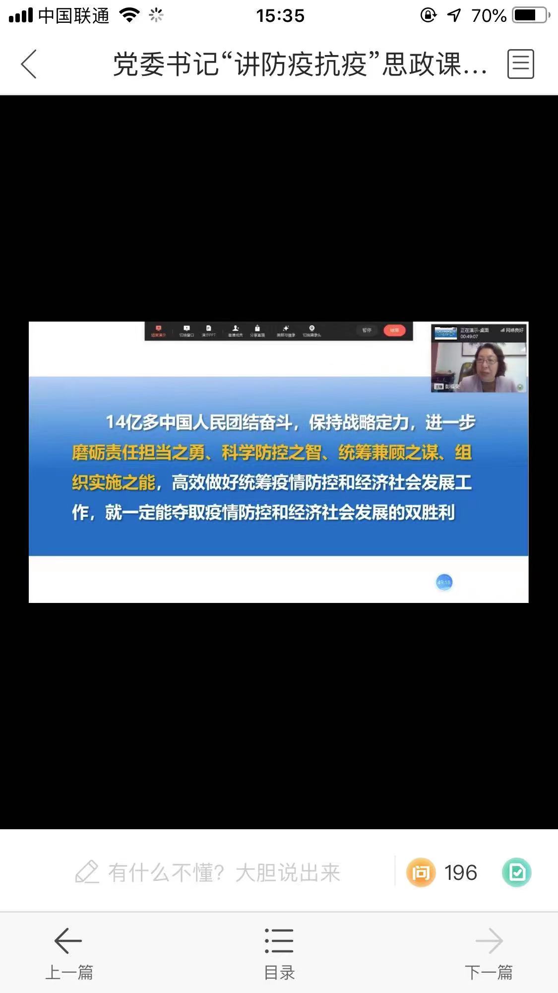 为深入贯彻落实自治区党委、市委关于疫情防控工作精神和学院党委关于疫情的工作部署,充分利用好抗疫生动教材,弘扬伟大抗疫精神,加强思想政治引领,切实增强思政课的针对性和实效性,用伟大抗疫精神助力学生成长成才,10月15日下午,学院党委书记曹红为全院师生线上讲授了一堂精彩的思政大课。