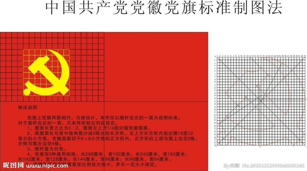 党章第五十二条规定:“中国共产党党旗为旗面缀有金黄色党徽图案的红旗。”为贯彻这一规定,中共中央办公厅1996年9月21日印发了《中国共产党党旗党徽制作和使用的若干规定》,明确党旗的旗面长宽之比为3:2,旗面左上方1/4部分缀党徽图案。
