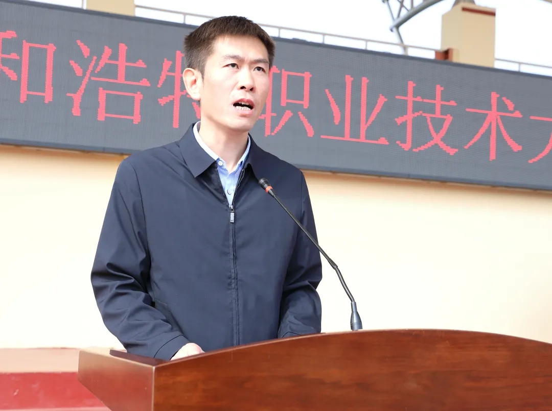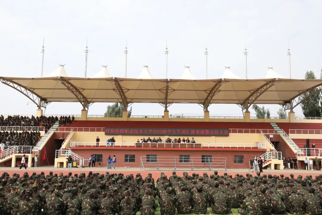 微风和煦、秋意正浓。2025年9月21日上午,呼和浩特职业技术大学2025级学生军训汇报表演暨总结表彰大会在体育场隆重举行。学校党委委员、校领导,武警内蒙古总队机动支队中尉张景富、新城区委常委、区人民武装部政委宋晓光,各行政处室负责人,各系(部)党总支(支部)书记、主任、学团工作人员及2025级全体新生参加了大会。大会由党委副书记白海林主持。