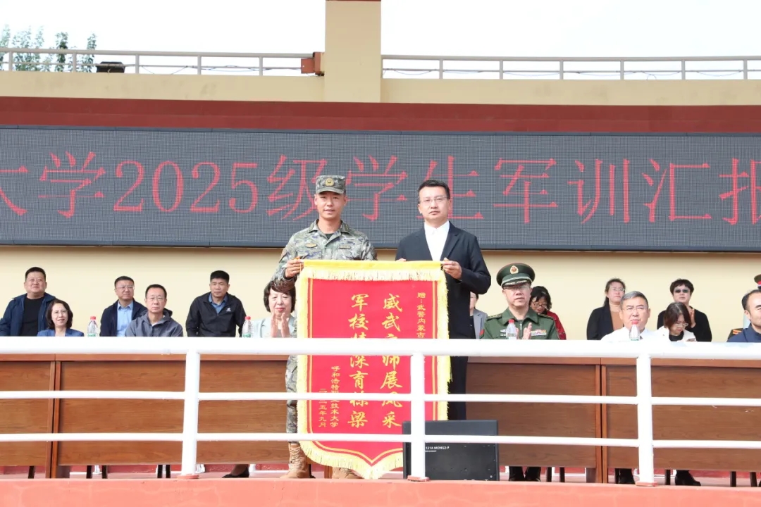 杨乌日吐代表学校向武警内蒙古总队机动支队赠送锦旗,感谢其长期以来对我校新生军训和学生国防教育工作的支持。