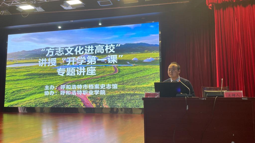讲座由市档案史志管地方志科副科长孟和巴特尔主讲,学院党委副书记白海林、呼和浩特市档案史志馆党总支副书记、副馆长郝利忠一行出席,各系部师生代表共同聆听本次讲座。讲座由学生工作处副处长朱海旺主持。