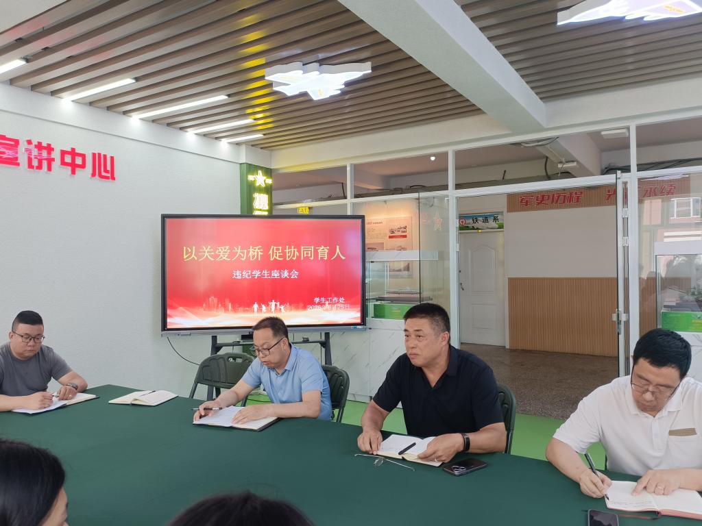 为进一步强化对违纪学生的教育引导,2025年6月25日上午,学生工作处在8号公寓楼文化阵地组织召开了违纪学生座谈会。学生工作处处长魏好毕斯、相关系(部)分管学生工作副主任及违纪学生代表参加了会议,会议由学生工作处副处长朱海旺主持。
