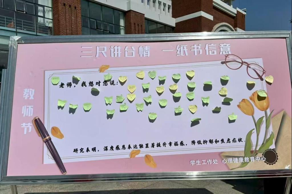 2025年9月10日,在第41个教师节来临之际,我校心理健康教育中心以“三尺讲台情 一纸书信意”为主题举办教师节感恩活动。通过“线下互动+线上征集”的形式,为师生搭建情感沟通的桥梁,用笔墨传递心意,以温情凝聚力量,营造了尊师重教、暖意融融的校园氛围。