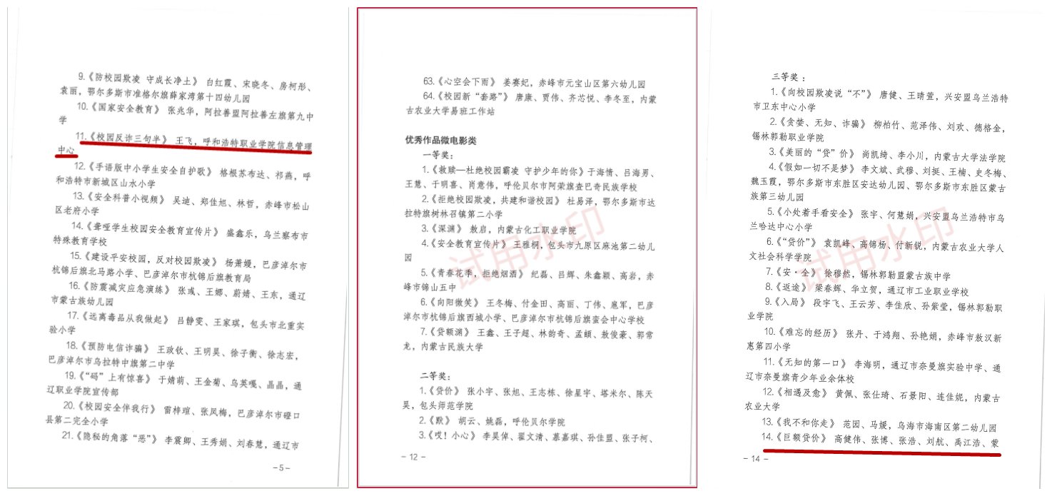 《巨额贷价》高健伟、张博、张浩、刘航、禹江浩、蒙皓,呼和浩特职业学院,获优秀作品微电影类三等奖。