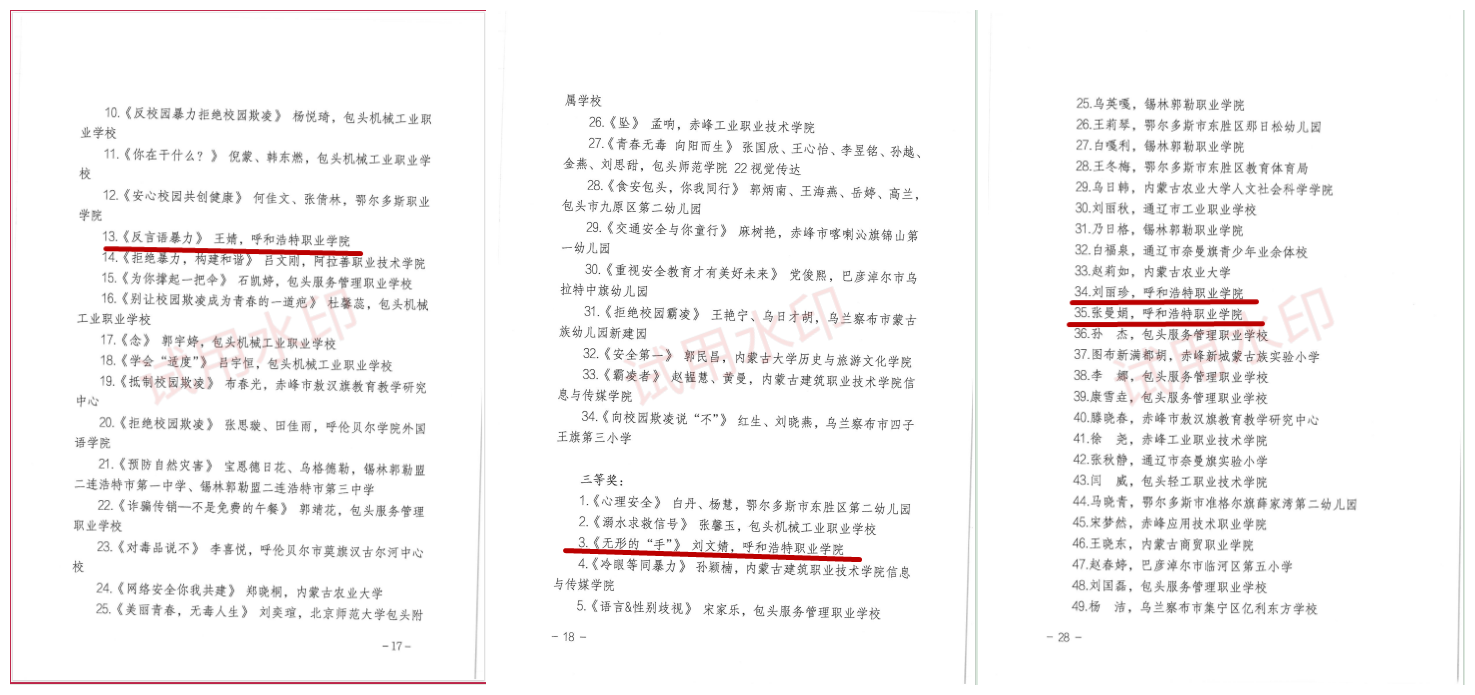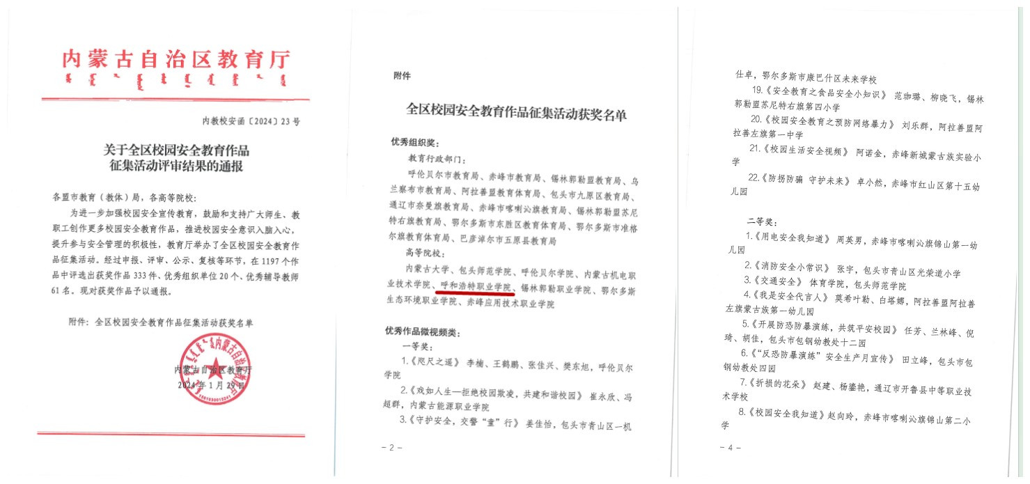 近日,内蒙古自治区教育厅发布了《关于全区校园安全教育作品征集活动评审结果的通报》(内教校安函[2024]23号),学院荣获多个奖项。