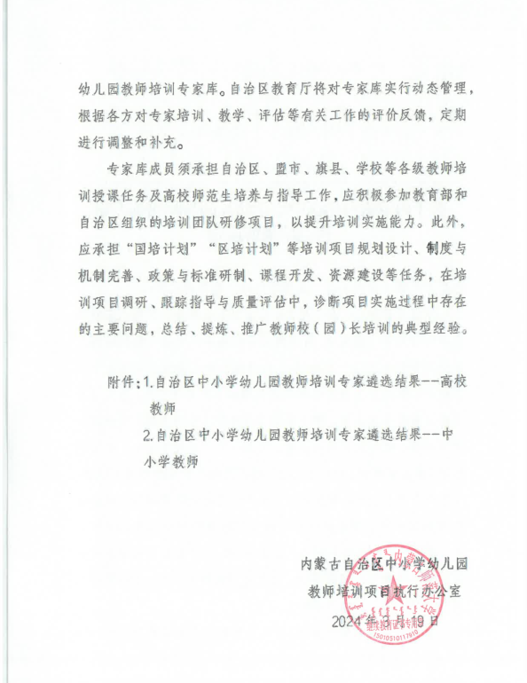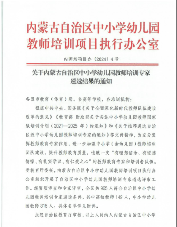 根据《关于内蒙古自治区中小学幼儿园教师培训专家遴选结果的通知》(内师培项目办[2024]4号),学院9名教师入选内蒙古自治区中小学幼儿园教师培训专家库。