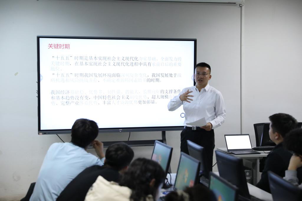 学校党委坚持落实中共中央办公厅、国务院办公厅印发的《关于深化新时代学校思想政治理论课改革创新的若干意见》中的第五条第19款“高校党委书记、校长作为思政课建设第一责任人,要结合自身学科背景和工作经历,带头走进课堂听课讲课,带头推动思政课建设,带头联系思政课教师”的精神要求。近年来学校领导积极发挥示范带头作用,带头常态化讲思政课,11月13日上午,学校党委副书记、院长杨乌日吐教授在图书馆五楼12机房,以“携手奋进十五五,建功立业新征程-----学习贯彻党的二十届四中全会精神”为主题,为计算机系2025级民族预科班讲了一堂兼具思想深度与实践指导意义的形势与政策思政课。