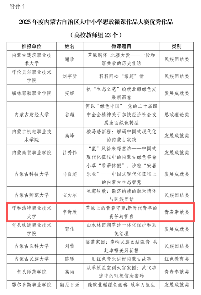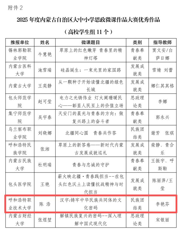 近日,自治区团委公布2025年度内蒙古自治区大中小学思政微课作品大赛评选结果,我校师生凭借扎实的专业功底与生动的思政表达,获两项优秀作品奖。其中,马克思主义学院教师李岢欣的作品获评高校教师组优秀作品,学生陈浩的作品获评高校学生组优秀作品。