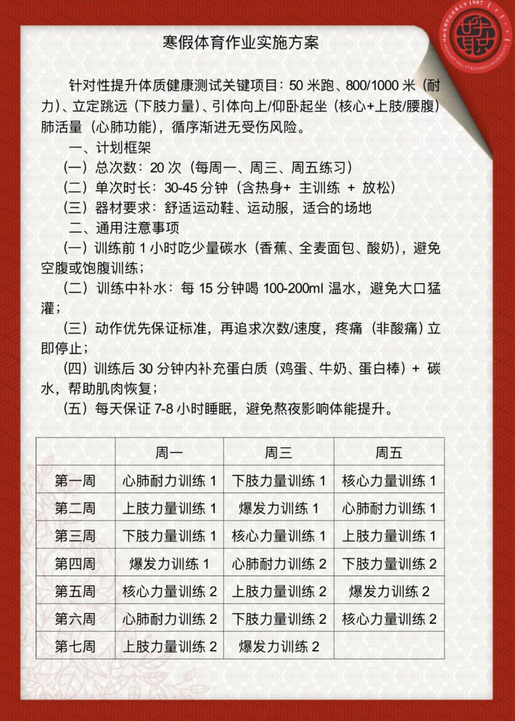 作为培养新时代职业人才的摇篮,学校始终将身体素质作为人才核心素养的重要支撑。接到教育厅通知后,由体育教学部、学生工作部牵头,各二级学院协同参与迅速制定假期作业,严格遵循“科学系统、规律适量、安全第一”的原则,结合《国家学生体质健康标准》制定涵盖“综合体能、专项技能、体育项目爱好”的体育作业。