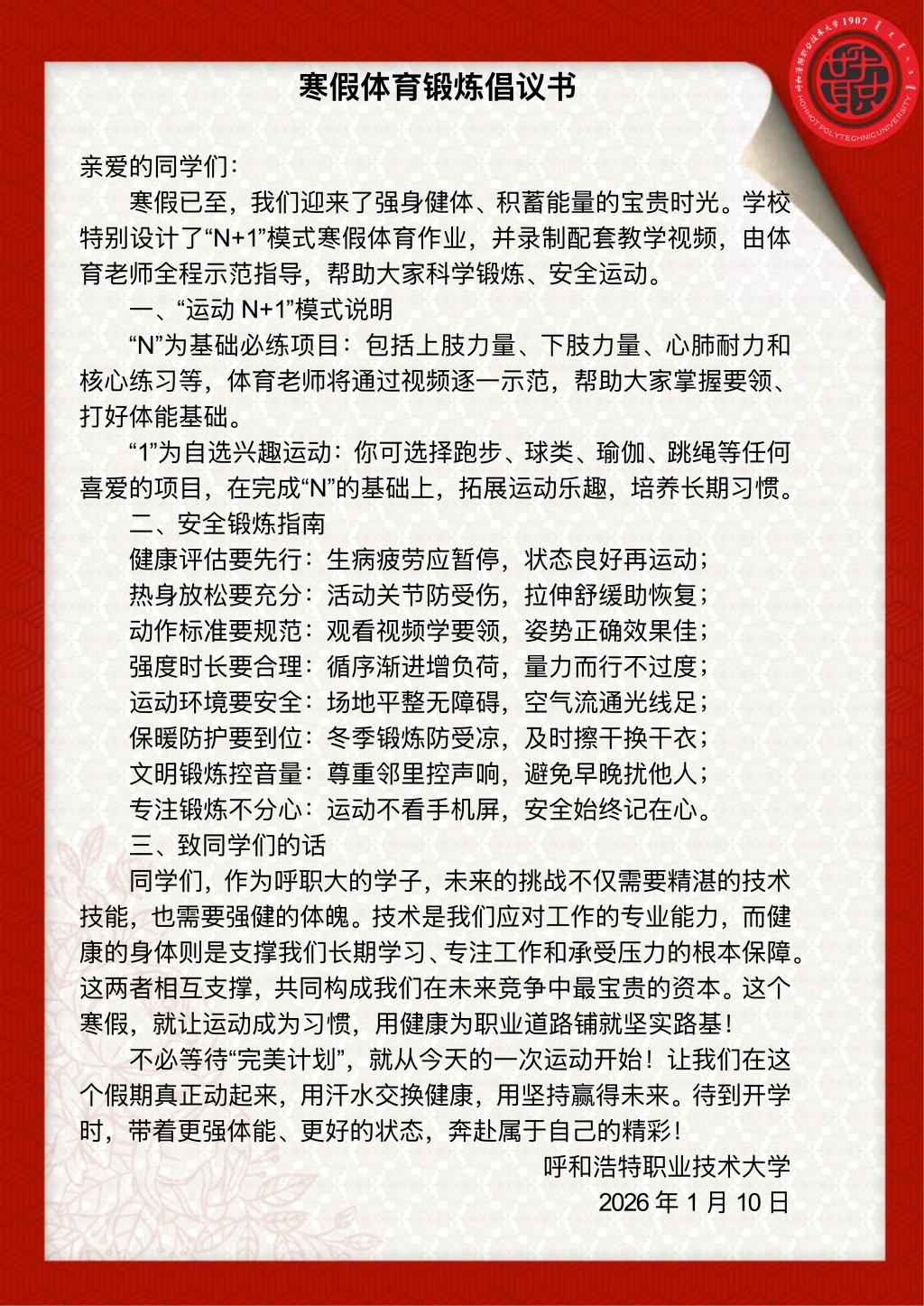 为深入贯彻落实内蒙古自治区教育厅《关于常态化安排学生节假日体育作业的通知》精神,全面落实立德树人根本任务,我校高度重视、迅速行动,以提升学生身体素质与运动技能为核心,科学谋划、精准施策,扎实推进节假日体育作业常态化实施工作,目前全校学子已积极投入假期体育锻炼,以昂扬风貌践行新时代高校学子的责任与担当。