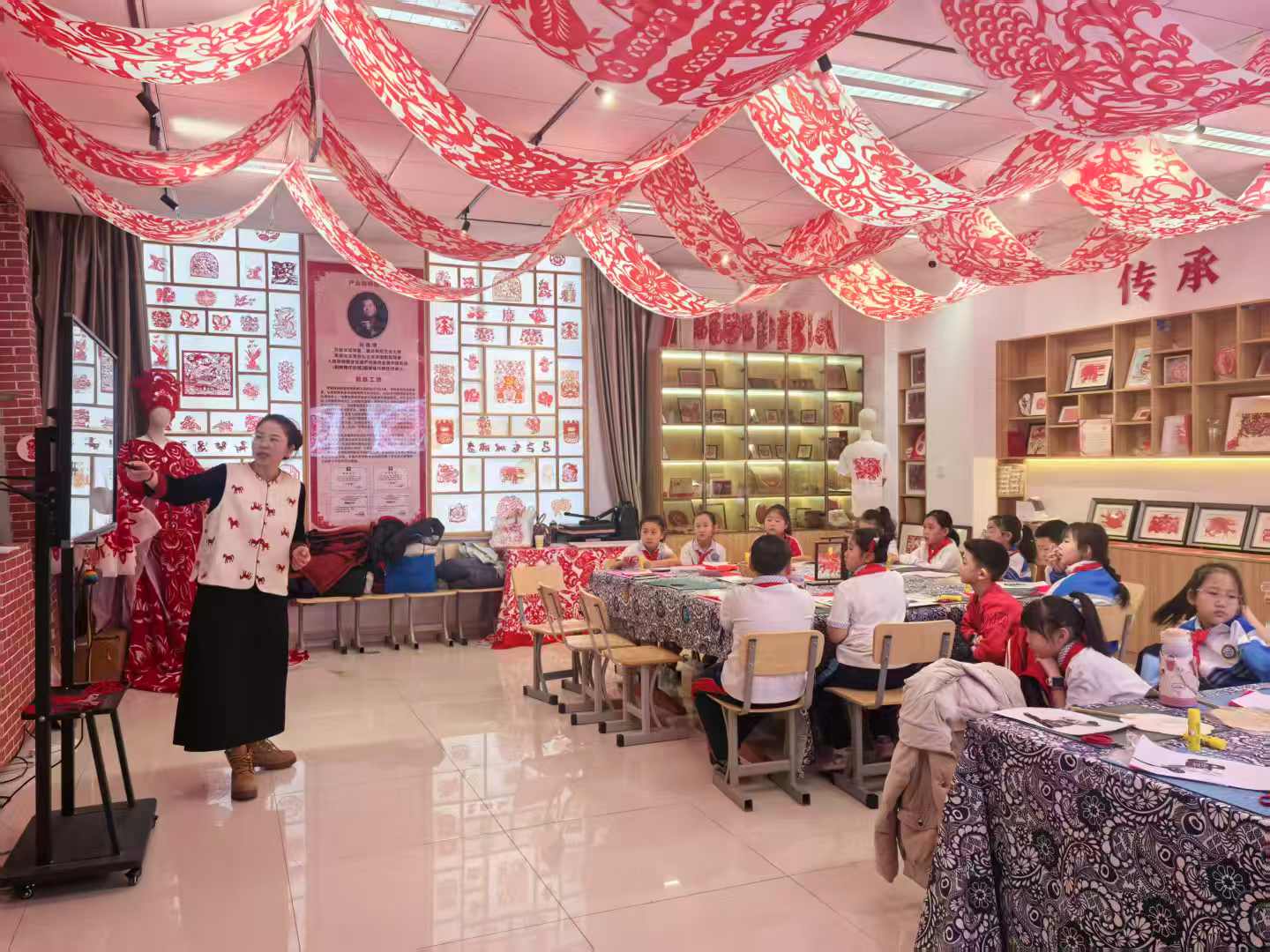 作为非遗文化传播与实践平台,工坊依托专业资源搭建研学场景,通过陈列生肖套剪、吉祥纹样等传统剪纸作品,直观呈现非遗艺术魅力。活动中,工坊教师系统传授剪纸折、画、剪技法,详解“倒剪福字”“花鸟纹样”等民俗寓意,将技艺教学与文化解读深度融合,助力小学生理解传统文化内涵。