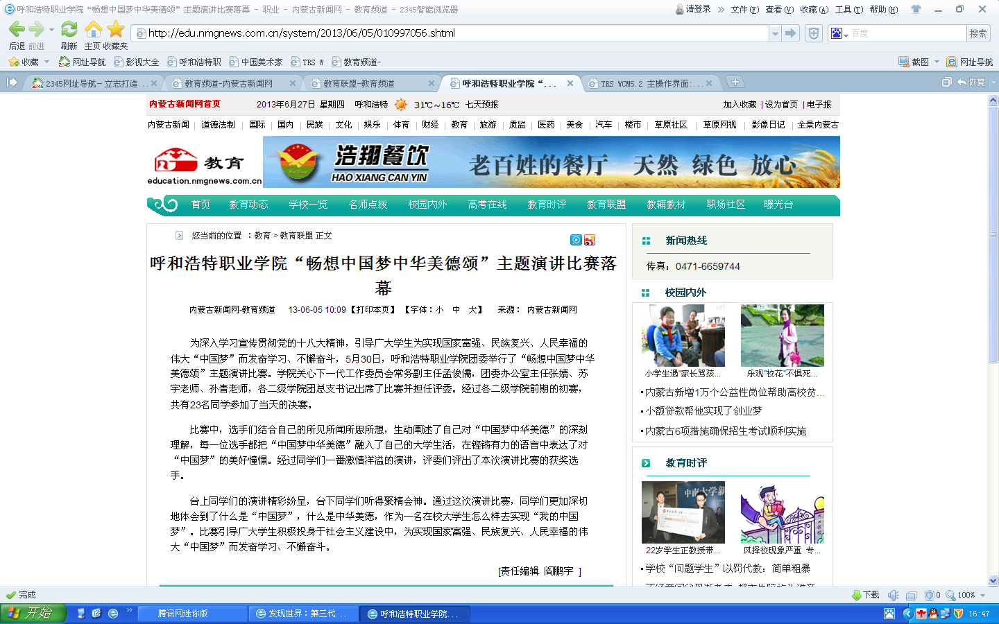 呼和浩特职业学院“畅想中国梦中华美德颂”主题演讲比赛落幕