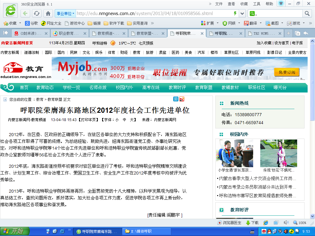 呼职院荣膺海东路地区2012年度社会工作先进单位