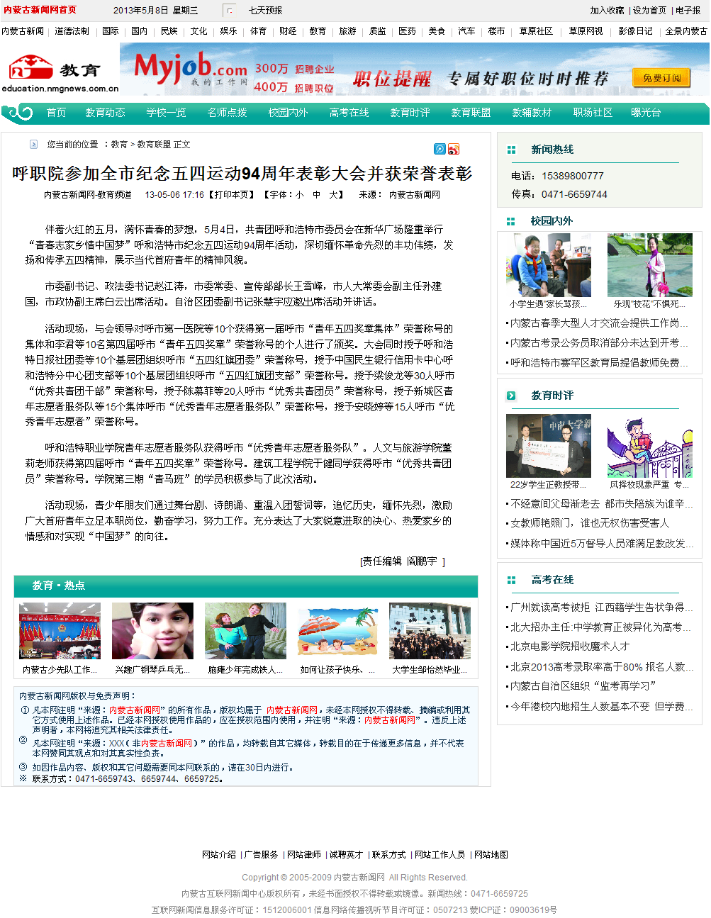 呼职院参加全市纪念五四运动94周年表彰大会并获荣誉表彰