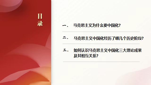 王晓蕙教授从“马克思主义为什么要中国化?马克思主义中国化经历了那几个历史阶段?如何认识马克思主义中国化三大理论成果及其相互关系?”三个方面分别阐述了马克思主义中国化的必要性、“马克思中国化”的提出和“马克思主义中国化”的科学依据;介绍了马克思主义中国化经历的从新民主主义革命时期一直走向中国特色社会主义新时代的的历史进程;阐述了如何认识毛泽东思想、中国特色社会主义理论体系、习近平新时代中国特色社会主义思想这三大马克思主义中国化理论成果及其相互关系。为同学们解答了马克思主义为什么行,中国共产党为什么能,中国特色社会主义为什么好。为同学们深刻理解马克思主义为什么具有强大的生命力,马克思主义为什么是指引人类前行的科学理论,对于坚定马克思主义在中国的根本指导地位,坚定广大青年学子共产主义理想信念具有重要的意义。