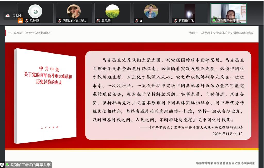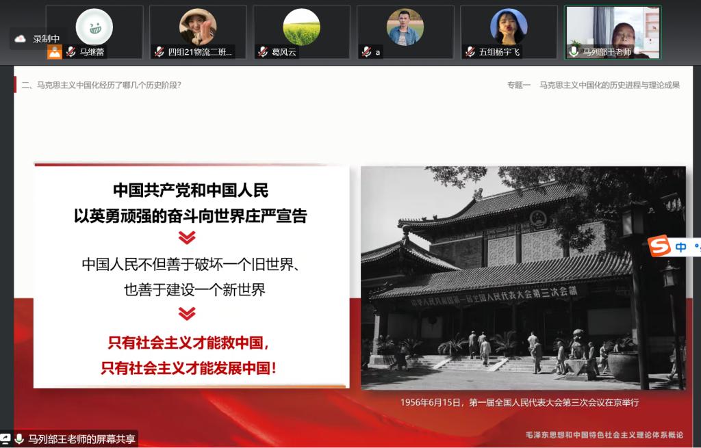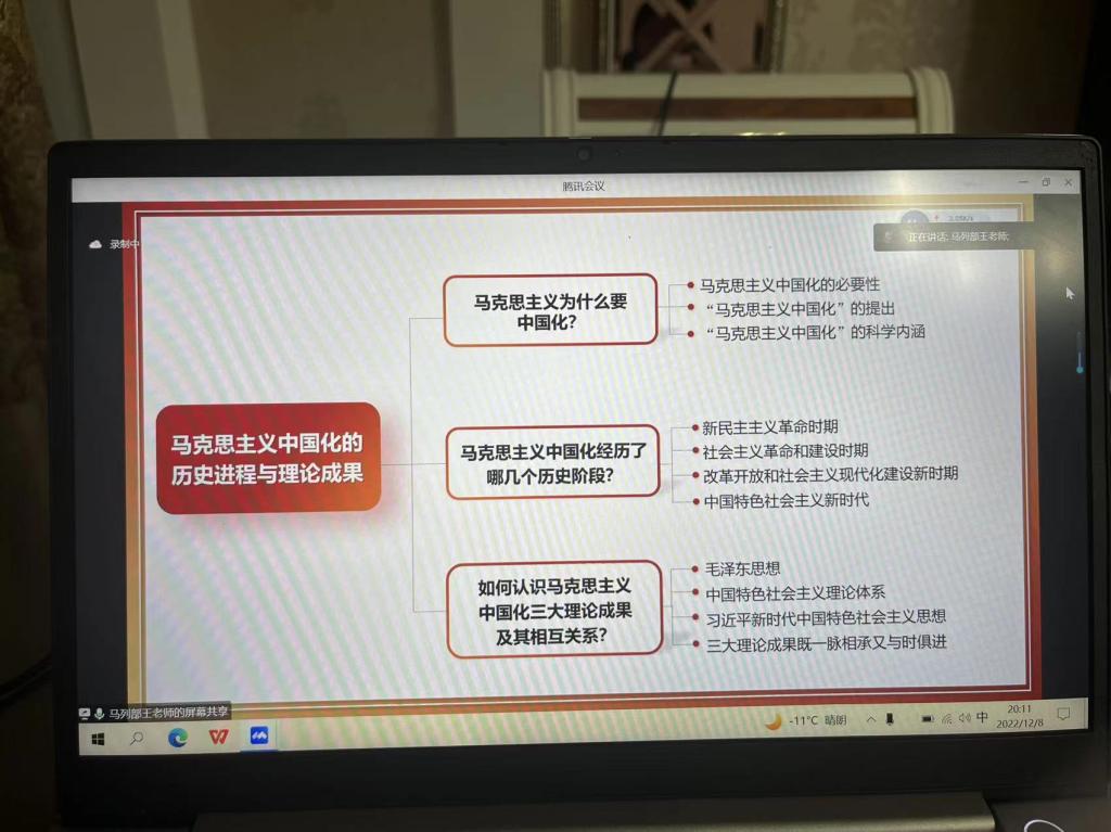 为深入学习宣传贯彻党的二十大精神,根据《呼和浩特职业学院学习贯彻党的二十大精神宣讲工作方案》部署要求,2022年12月8日晚,经济管理与法学系学生党支部特邀马列部教授,学院党建、行政督导组成员、经法系组织员王晓惠老师为青年学子们讲授题为《马克思主义中国化的历史进程与理论成果》的党课。本次党课宣讲通过腾讯线上形式举行。经法系党总支书记葛风云、学生党支部全体党员、经法系全体入党积极分子参加了本次党课宣讲活动。