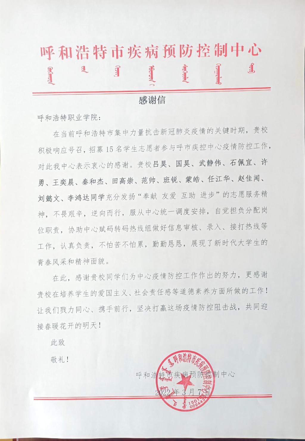 3月7日,市疾控中心特地为学院发来感谢信,感谢在呼和浩特市集中力量抗击新冠肺炎疫情的关键时期,学院积极响应号召、贡献力量,感谢同学们为中心疫情防控工作作出的努力,更感谢学院在培养学生的爱国主义、社会责任感等道德素养方面所做的工作!