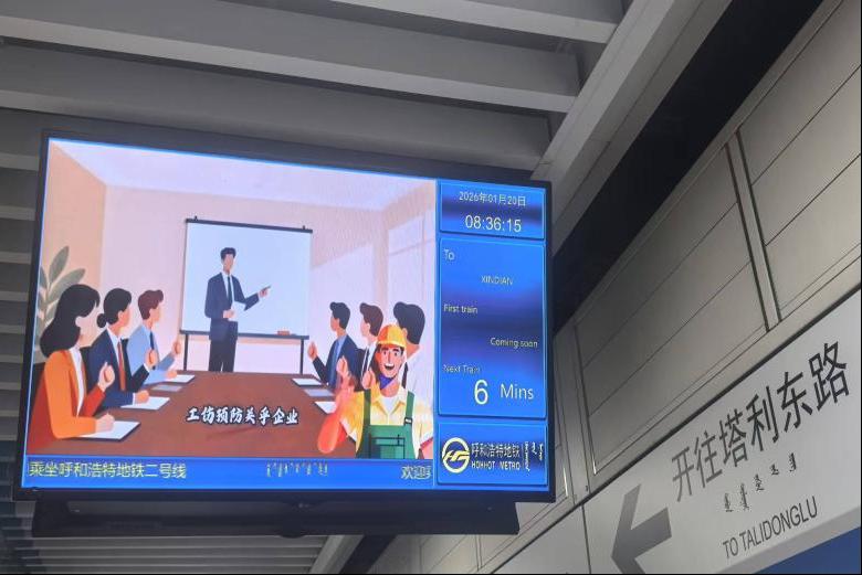为突破传统培训宣传局限,我校配合呼和浩特市社会保险事业服务中心,创新构建“流动+定点”相结合的宣传模式,依托城市公共交通体系,参与在200余个公交站点投放工伤预防主题公益广告及动画,在地铁1、2号线600余块候车屏滚动播放工伤预防知识等宣传工作。通过“定点宣传”触达候车人群,“流动传播”覆盖通勤全程,让工伤预防理念融入公共安全与城市文明建设,以更广维度守护青城大街小巷的“烟火气”,让工伤预防知识走进千家万户、惠及更多劳动者。